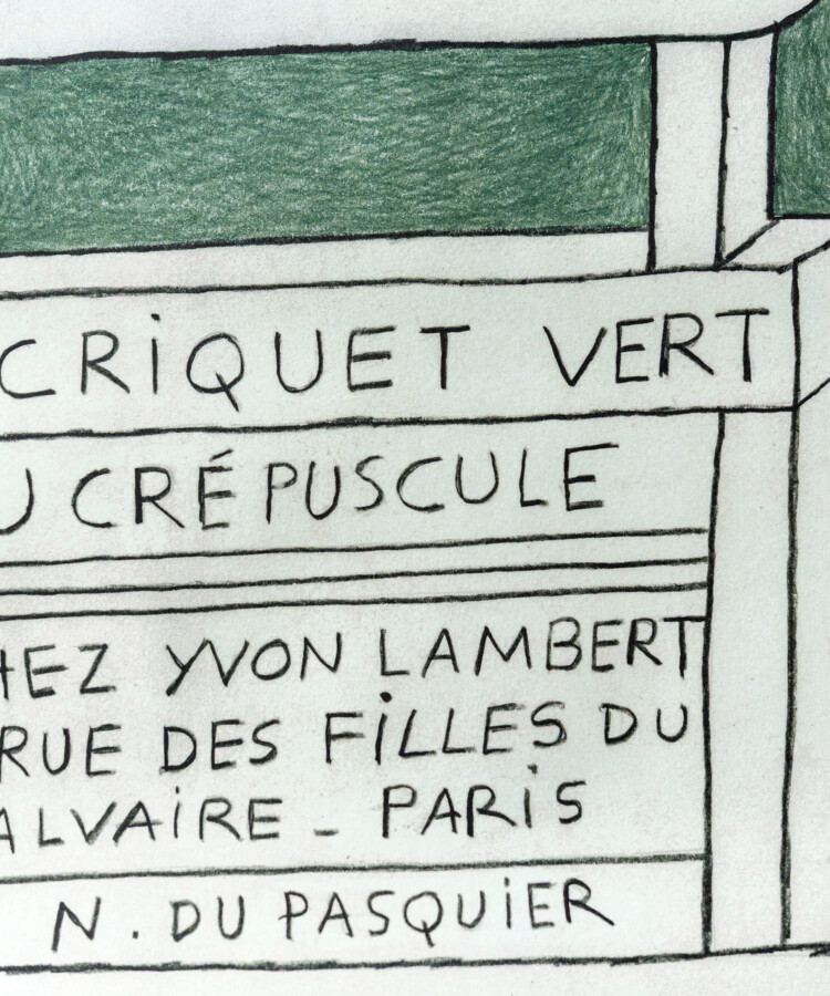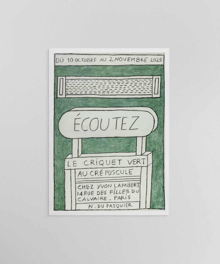 フランス出身のアーティスト、ナタリー・デュ・パスキエの、2025年にパリで開催されたエキシビション「Écoutez le criquet vert au crépuscule」のポスター。